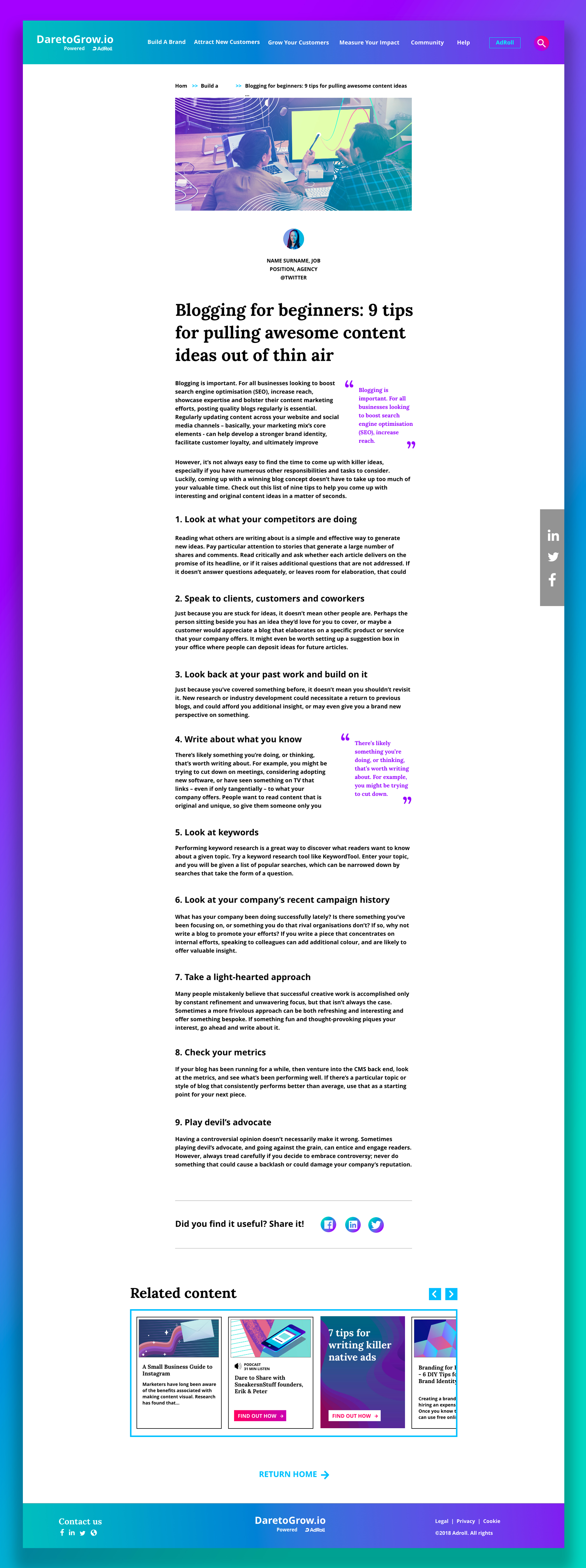 Our content formats spanned the entire spectrum: from BuzzFeed-style listicles and infographics to longer-form articles, guides and whitepapers. We designed the home page and the content page structure, as well as some assets (illustrations and infographics). The examples used are also relevant to the SME audience: rather than flagging the great work of behemoths like Amazon, for example, we research for smaller, more accessible brands.