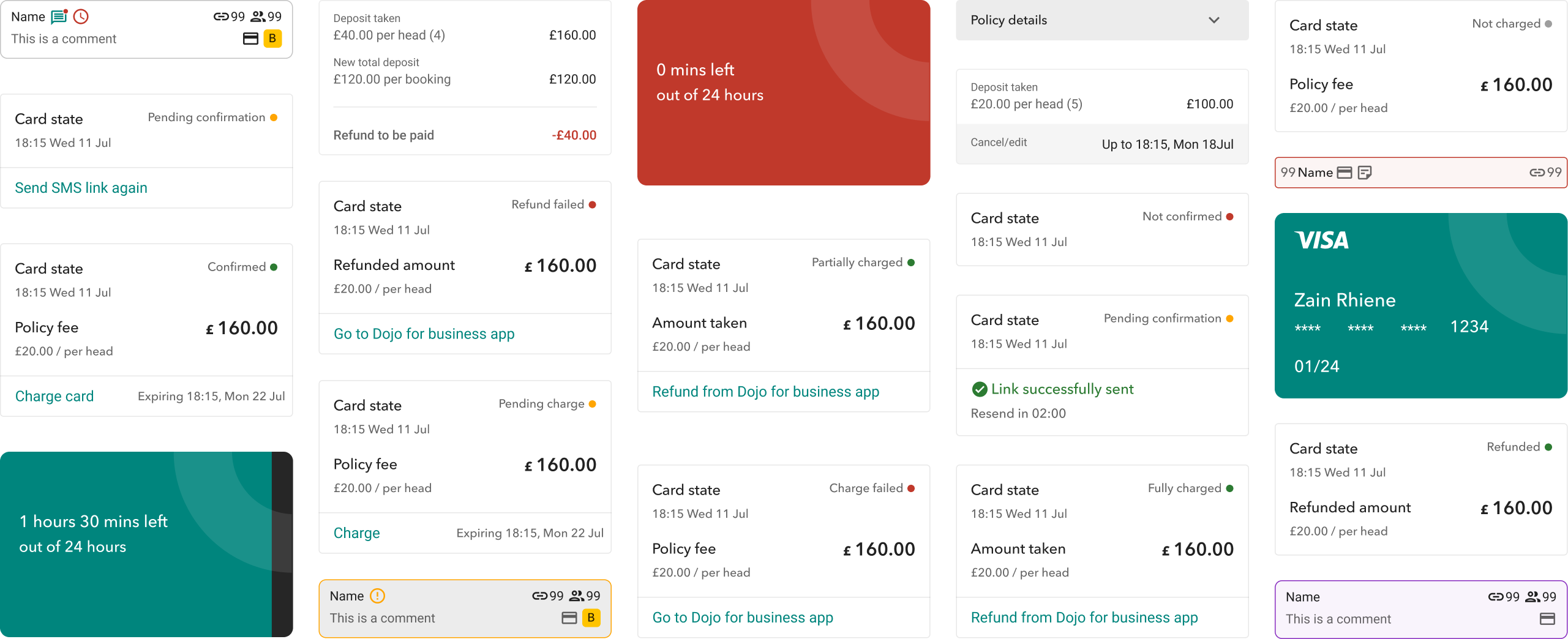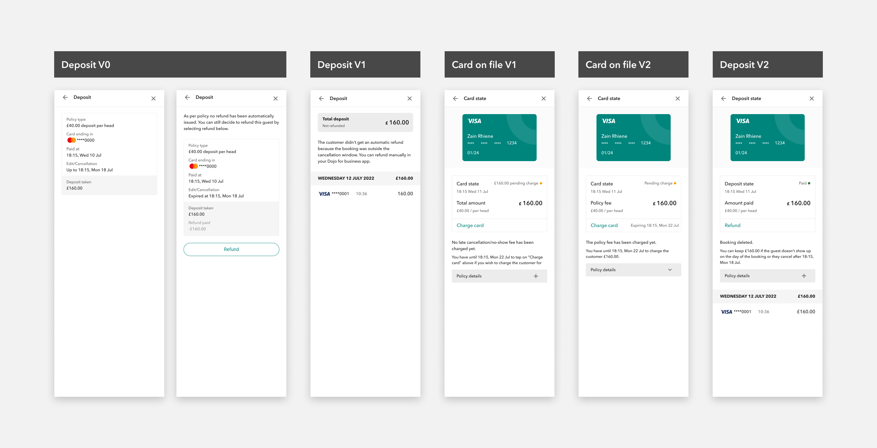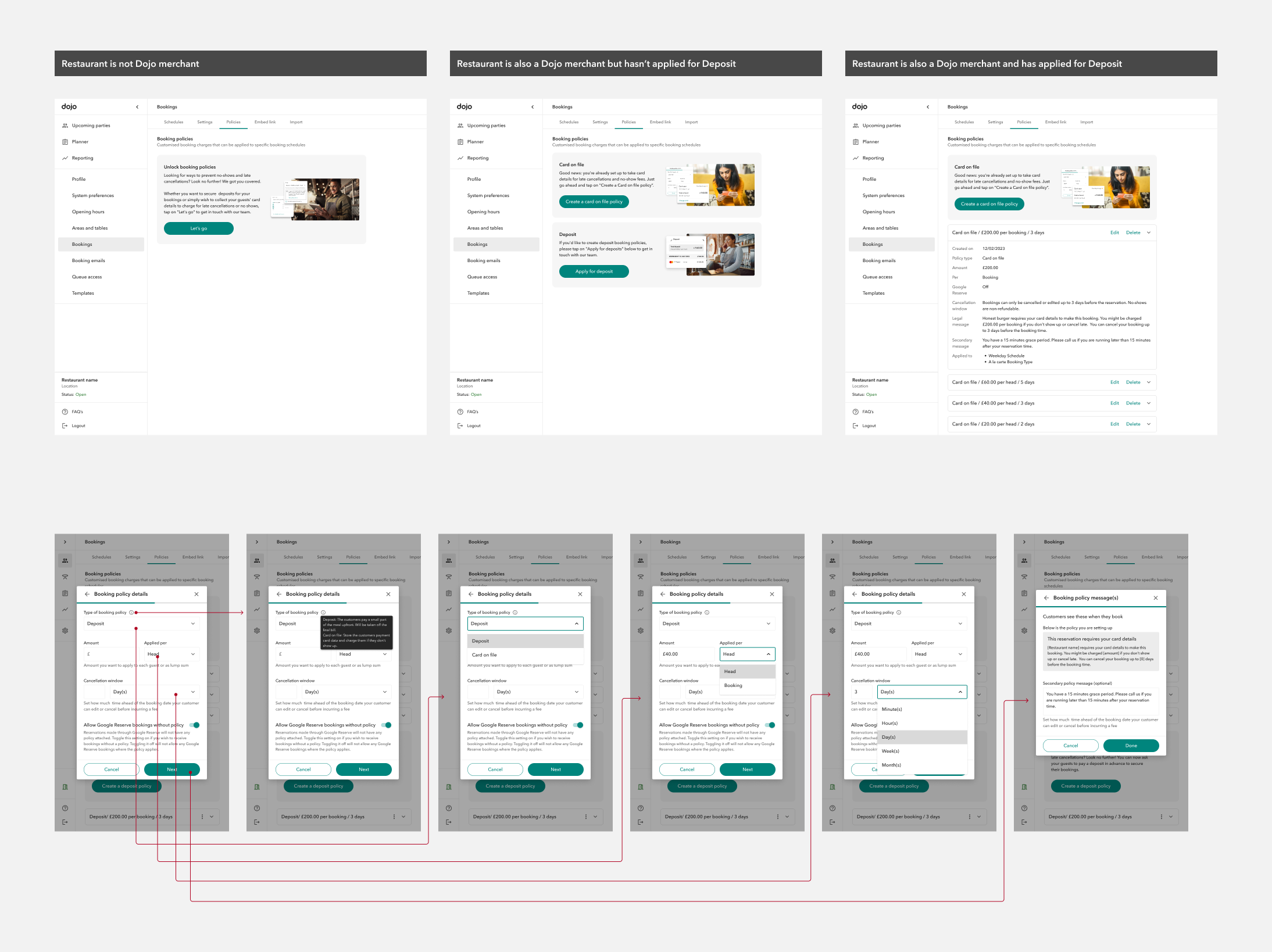 For P0, We decided to prioritise deposits. It was easier to achieve from a tech pov, with no dependencies with other part of the business and the flow of creation/deletion/editing were more straight forward. As per customers preference, deposit and card on file were both seen as an important step to prevent no-shows. For consumers, both policy types were seen as painful but depending on the case they would have agree upon either paying a deposit or give their card details.