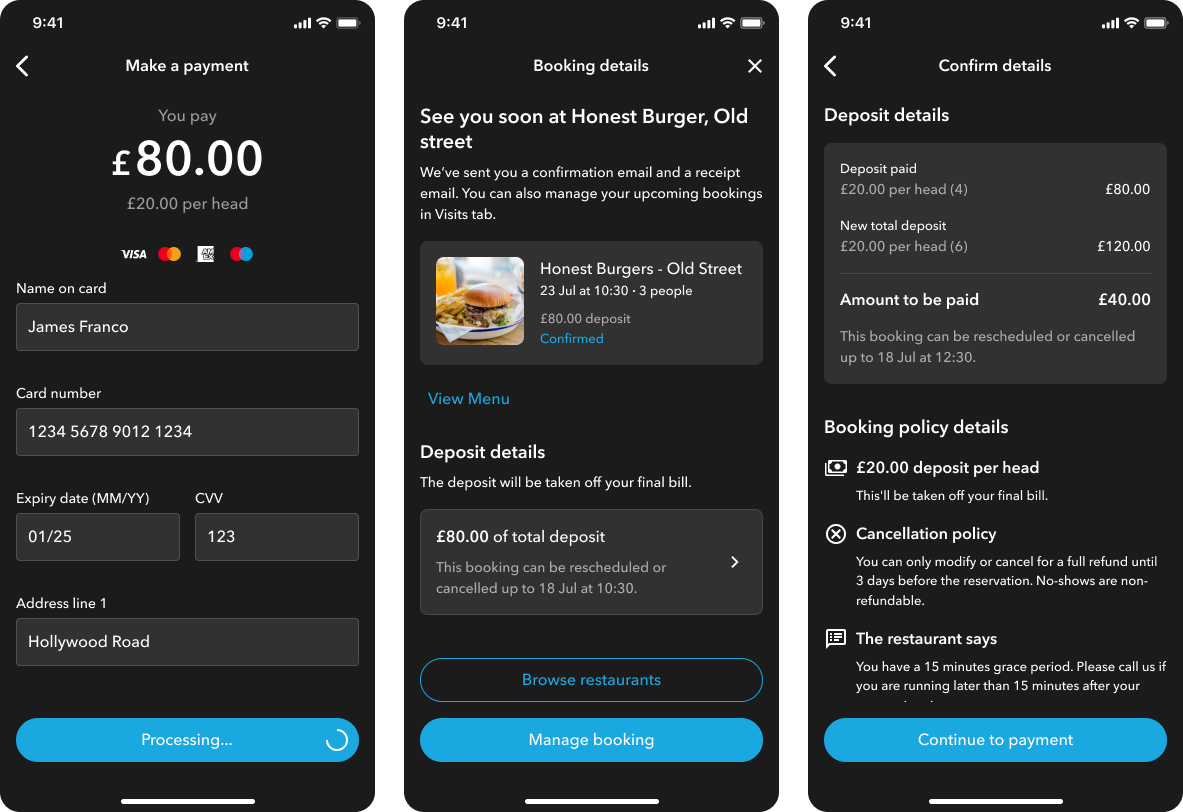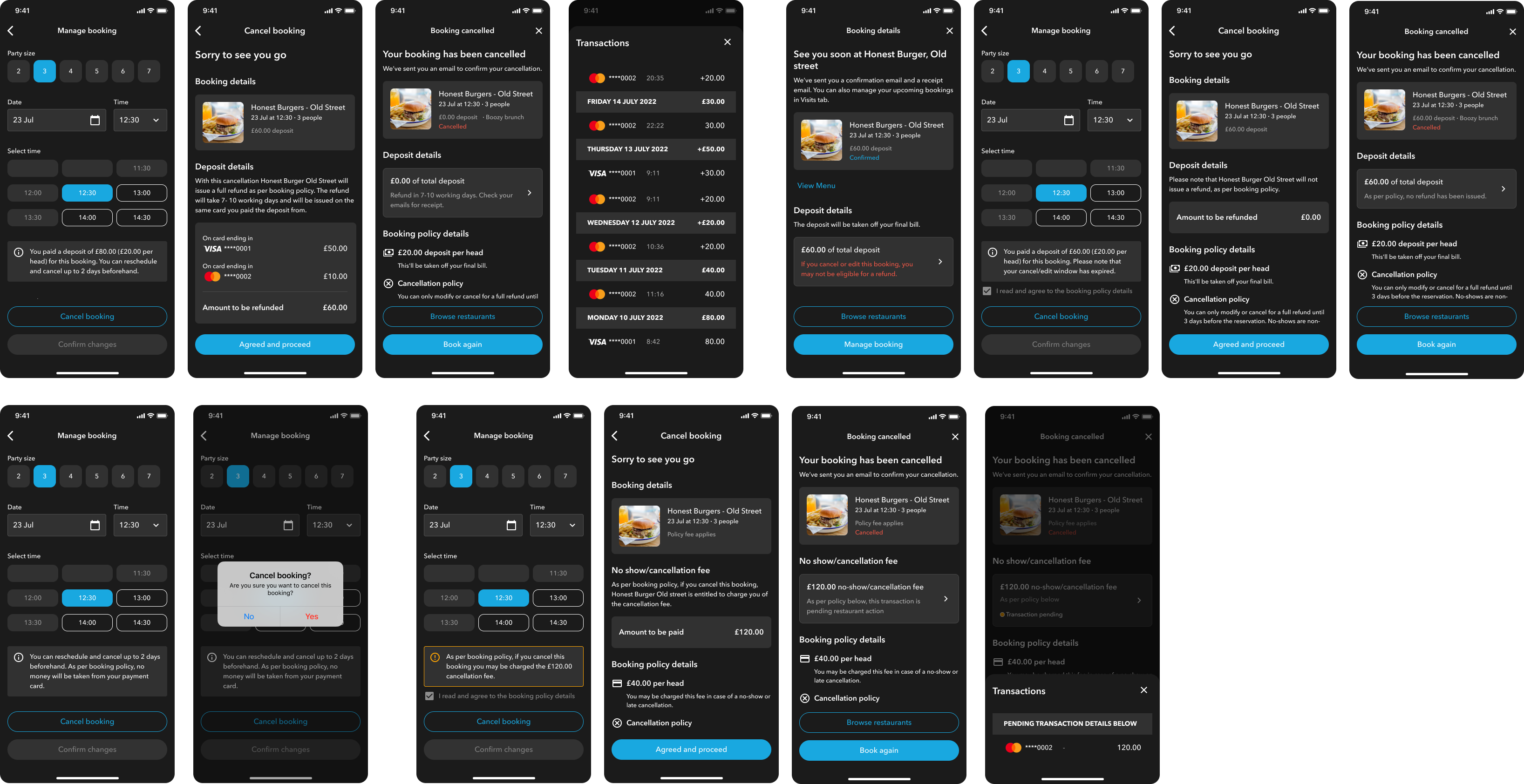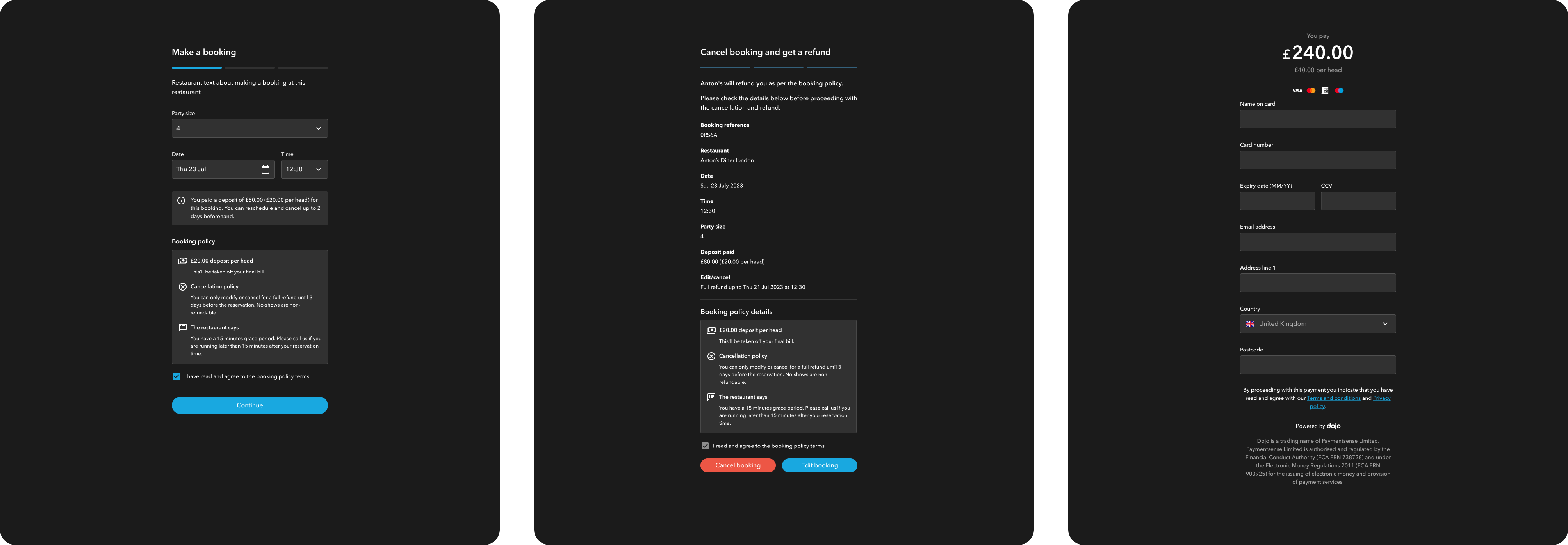 For P0, We decided to prioritise deposits. It was easier to achieve from a tech pov, with no dependencies with other part of the business and the flow of creation/deletion/editing were more straight forward. As per customers preference, deposit and card on file were both seen as an important step to prevent no-shows. For consumers, both policy types were seen as painful but depending on the case they would have agree upon either paying a deposit or give their card details.