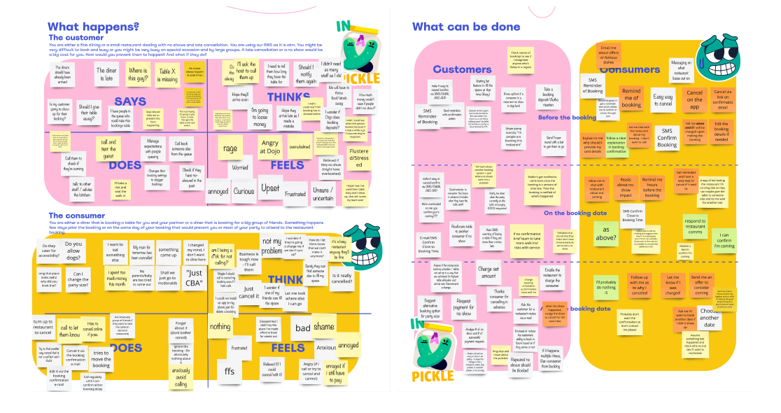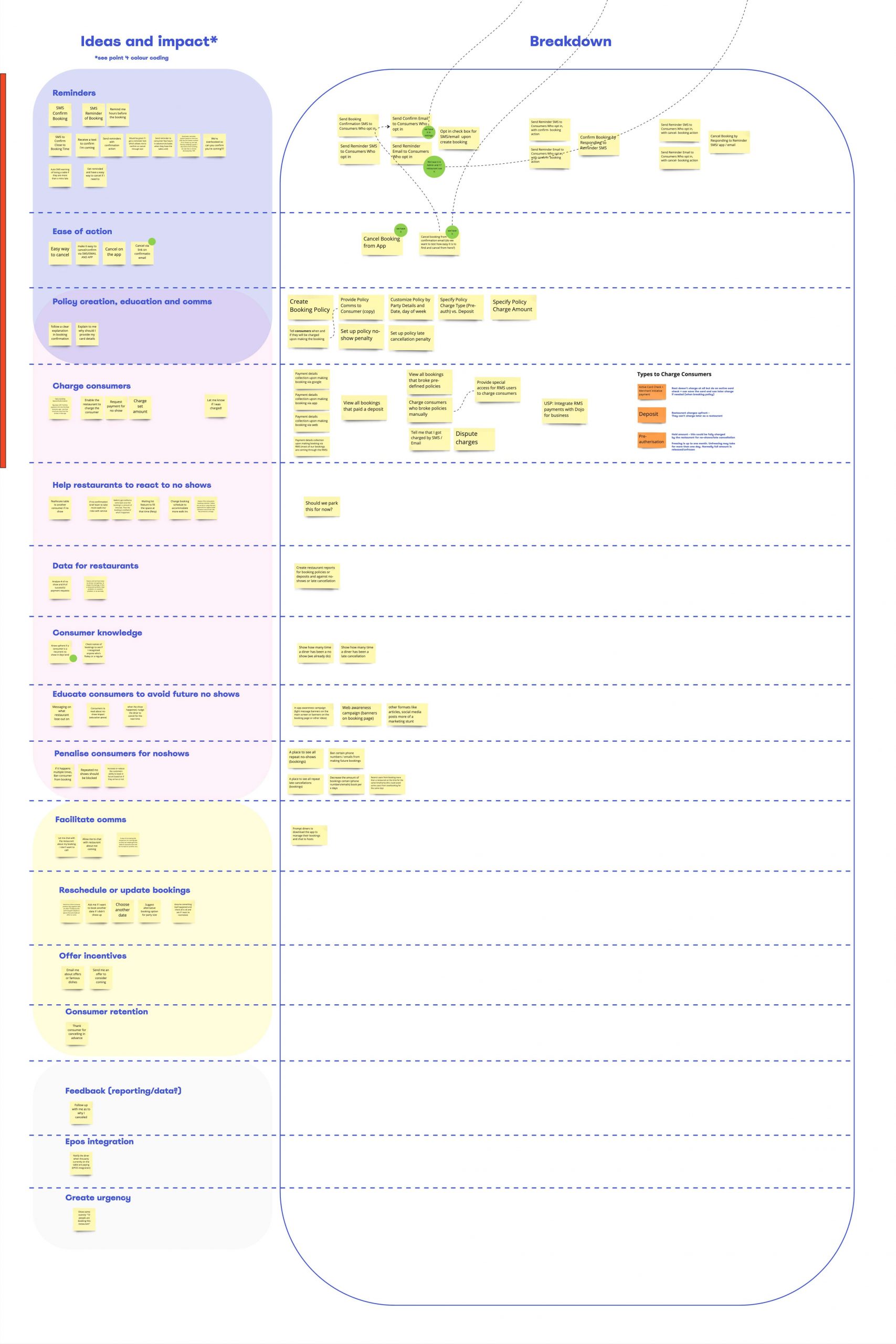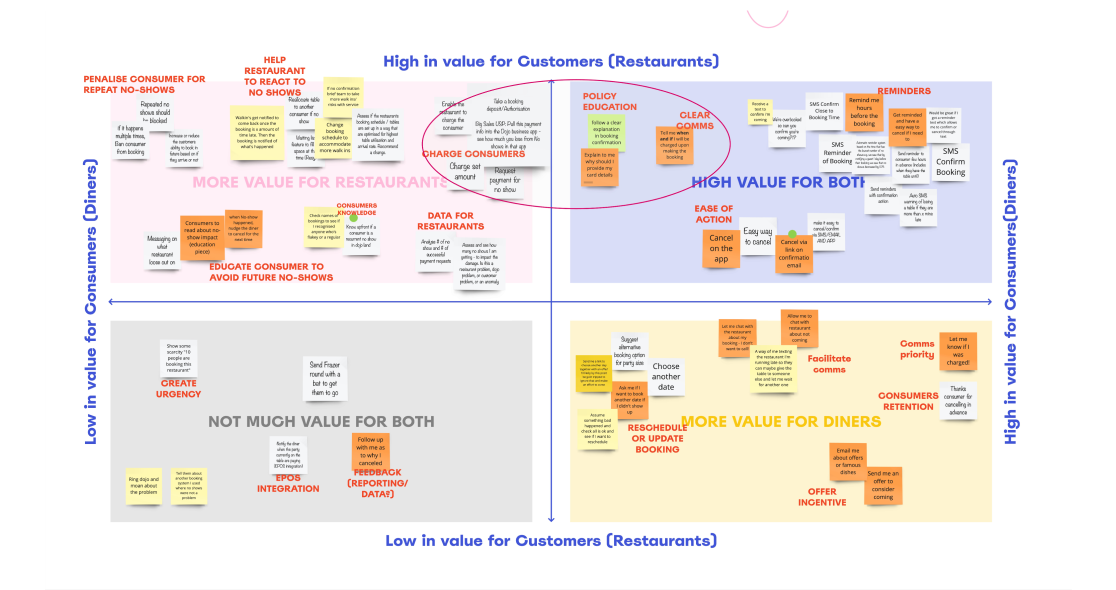 In this case we did an empathy mapping, brainstorm and a prioritisation matrix for both customers and consumers so we could understand what would have the highest value for both. As a results we identified 4 main areas: clear policy communication, easy way to cancel a booking with a policy attached, intuitive charge process and booking reminders.