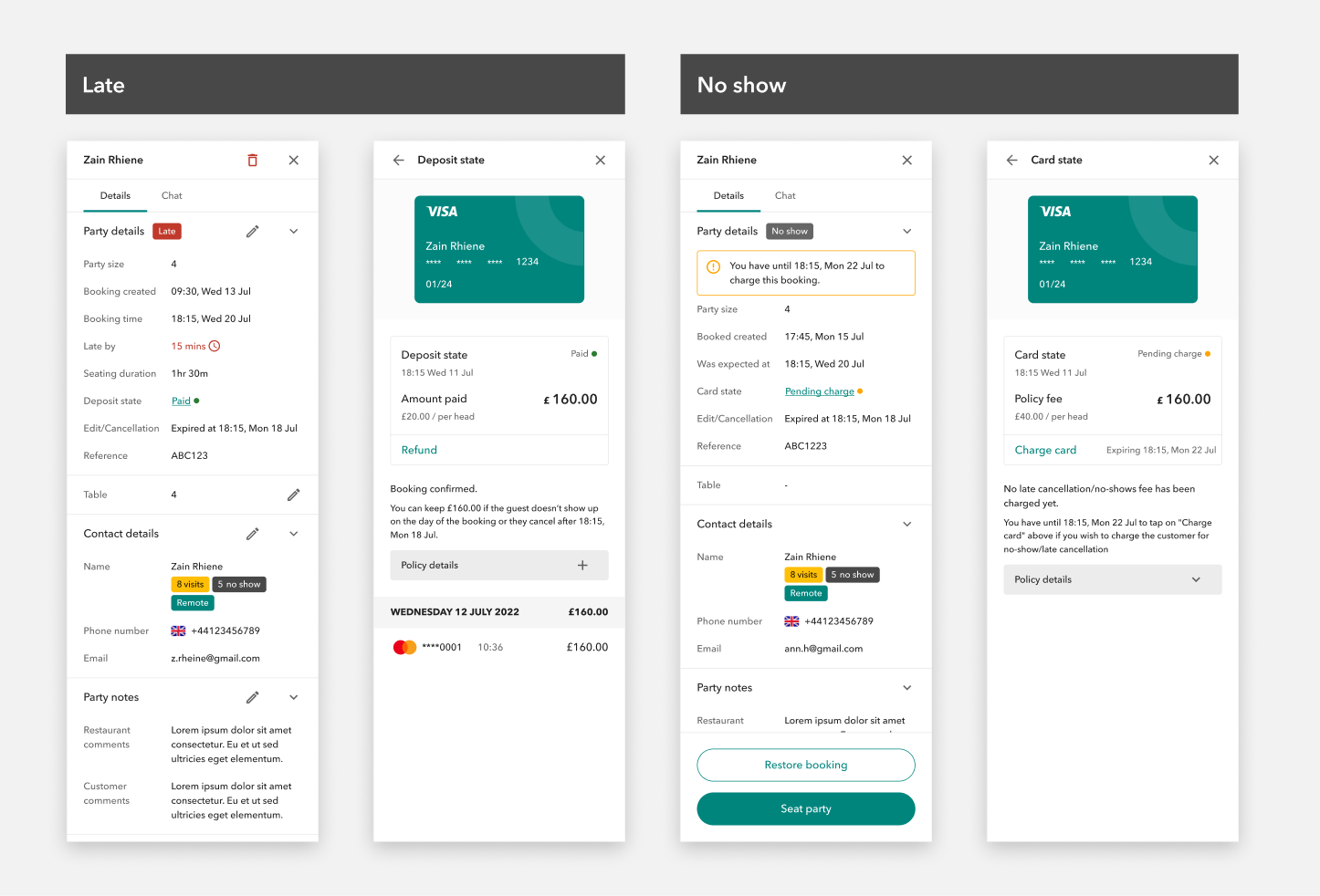 Initially the “no-show” state was automatically applied to all parties that would not be “seated” 15 minutes* after their booking starting time. Since then, we realised that, because of the complexity of hospitality sector, we could not make such an important decision become 1)an automated action, 2) that was based on a standardised time. As much as the initial solution was tolerable as an MVP, we quickly iterated to bring flexibility to all kind of hospitality businesses.