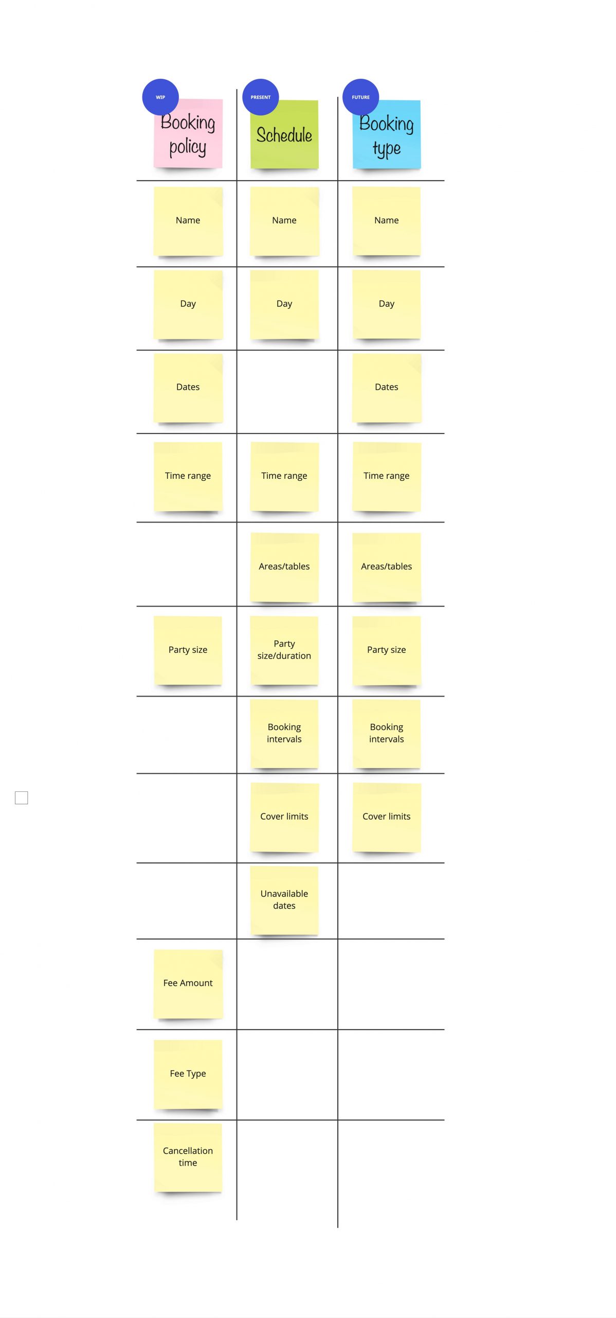 To organise my thoughts and start a conversation with the rest of the squad, I created a simple table to compare policies, schedules and experiences (previously known as ‘booking types”). The table listed what values were representative of each feature. What do they have in common and what not? The conclusion was that both policies and booking types should have belong within the schedule settings. This way, users had to insert the relevant information once and they all lived in one flow which would become handy during the schedules creation and any sort of editing.