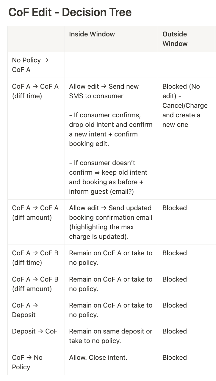 By conducting a competitive analysis I was able to assess the booking policy set up and management of our competitors, understand their pros and cons, as well as the way that booking policies were surfaced to consumers and their potential frustrations (which I experienced first hand).